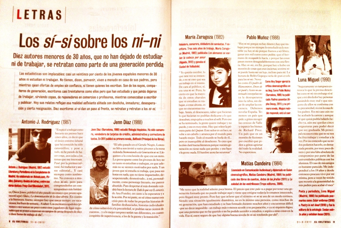 Una notita aparte… agradecer a Daniel, que nos escogió (al menos a mí), para este artículo. Que yo ahora renuncie a la juventud no quiere decir que critique la iniciativa, la idea y la generosidad. A veces los autores pensamos que mejor hablar de ser jóvenes y aparecer en El Cultural que no hablar de nada, y creo que nos equivocamos. Sólo digo que después de tanto teorizar los últimos días acerca del tema, llego a esta conclusión. No es mi intención echarle la culpa al articulista ni mucho menos, es más una autocrítica. Hoy me he dado cuenta de lo que acabo de escribir, por eso lo escribo hoy.